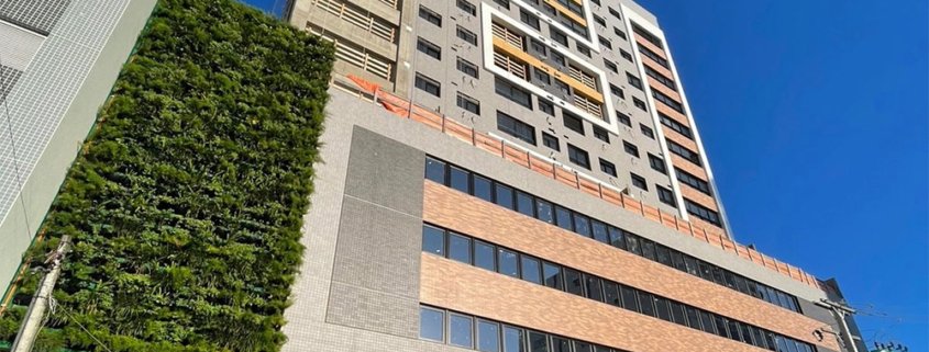 A colocação do gesso e do porcelanato está na fase final. A pintura externa e a aplicação das plaquetas avançam dentro do cronograma. A fachada já ganhou a parede verde que embeleza e dá ainda mais vida ao projeto.